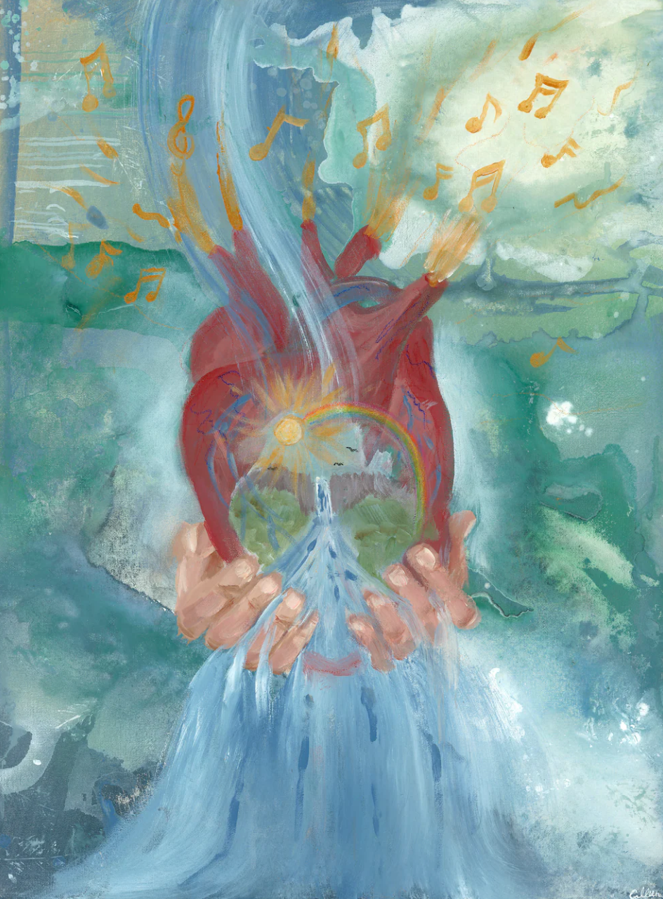As we entrust our hearts into the caring hands of Jesus, He puts His spirit within us and He washes and purifies us continually and satisfies our deepest needs. My favorite part of this artwork is the golden song notes bursting from the top representing the worship that has sprung forth from the transformation that God has brought about within me.